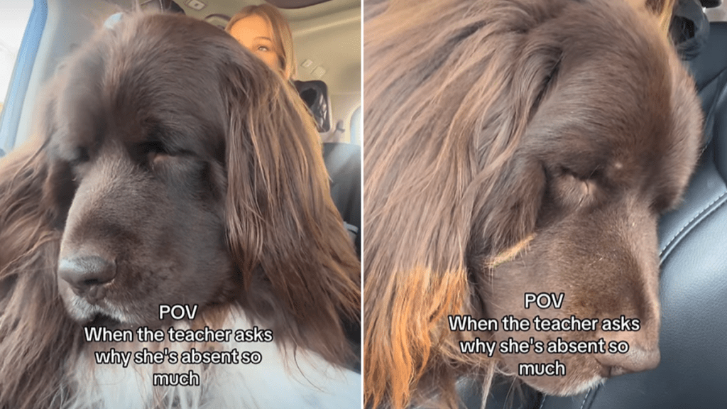 A big dog video is going viral after Chewy, a huge Newfoundland, looks heartbroken in the car. In this giant-dog reel, he acts as the world ends at school drop-off. Warm sunlight hits his fur, and his eyes stay heavy. The little girl behind him keeps trying to calm him down. Chewy does not budge, and that makes it funnier. The mood feels dramatic, but the bond feels real. It feels like a school-morning meme come alive.