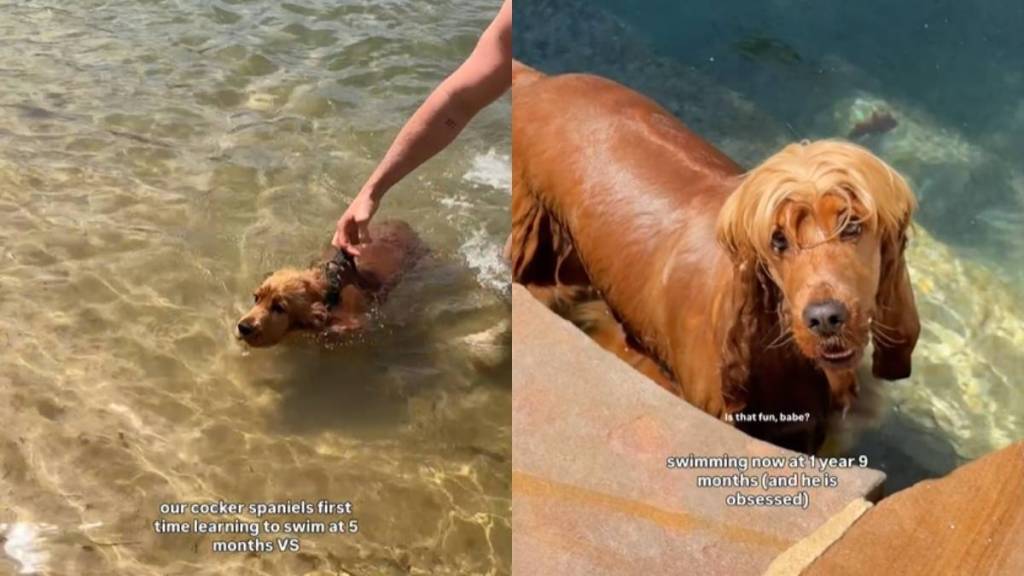 But then the video jumps forward, and the contrast is adorable. Now older and fluffier, Alfie heads for the pool like he owns the place. He doesn’t need help getting in, just plops himself right into the water, and starts cruising around with smooth strokes. He looks genuinely majestic, proving that he has been training for this his whole life.